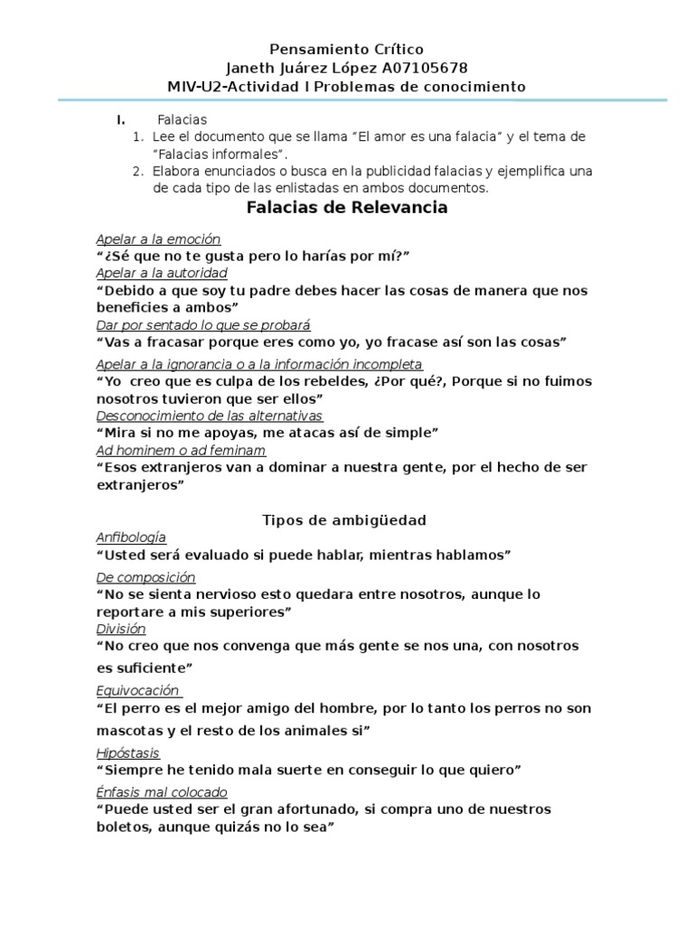 porque así lo siento cuando lo toco Tiene un aroma muy fuerte y concentrado. por lo tanto te servirá a ti también” Post Hoc o falsa causa “Mejor no llevemos vestidos. lo he olido Su música es relajante o así la percibo cuando la escucho Lógica Si uso mucho un objeto sin darle un adecuado cuidado se terminara dañando No todos los animales con alas vuelan porque hay que tener ciertas condiciones Si combino agua con electricidad me puedo electrocutar porque el agua es conductor Intuición Que si me acerco mucho al fuego me quemare Es inseguro hacer cosas a las que mi cuerpo no está preparado Destruir cosas puede traer consecuencias . Buenas Razones 1. Percepción Sensorial Su pelo es suave y sedoso. Elabora 3 enunciados de cada una de las buenas razones o evidencias para que afirmes tu propio conocimiento. siempre hay mucho viento cuando los llevamos” Ad Misericordiam o apelar a la lástima “Yo deseo ser mejor en mi desempeño pero debido a mi discapacidad me es imposible mejorar” Envenenar el pozo “Él no te conviene he escuchado que trata muy mal a sus novias” II. Lee la lectura “buenas razones por las cuales podemos afirmar saber algo”. 2.Pensamiento Crítico Janeth Juárez López A07105678 MIV-U2-Actividad I Problemas de conocimiento Dicto Simpliciter “Esta crema me ayudó mucho a mí y mis amigas.