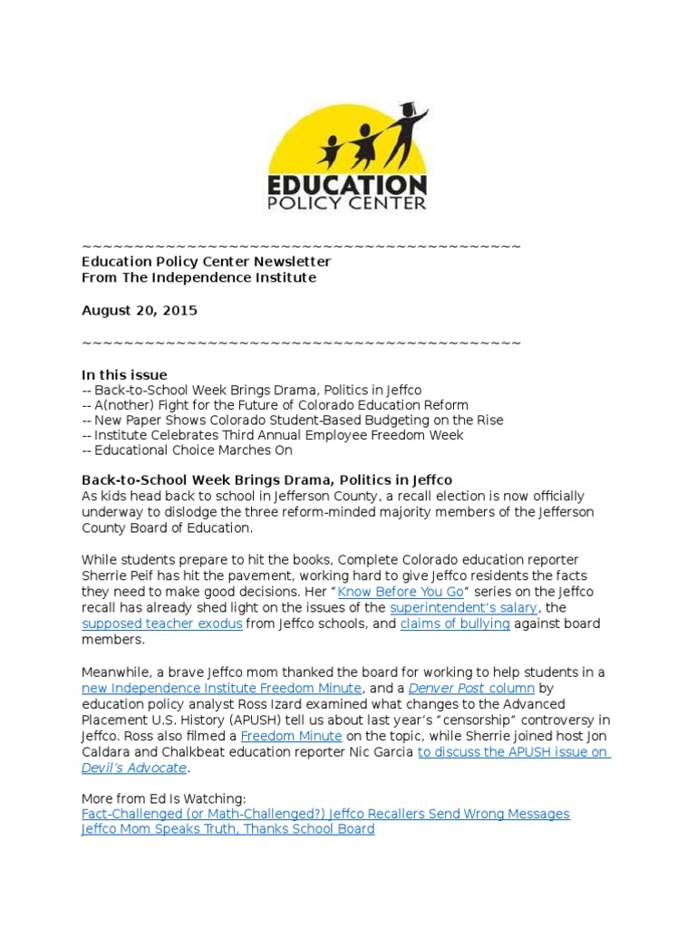From The Independence Institute August 20, 2015 ~~~~~~~~~~~~~~~~~~~~~~~~~~~~~~~~~~~~~~~~~~ In this issue -- Back-to-School Week Brings Drama, Politics in Jeffco -- A(nother) Fight for the Future of Colorado Education Reform -- New Paper Shows Colorado Student-Based Budgeting on the Rise -- Institute Celebrates Third Annual Employee Freedom Week -- Educational Choice Marches On Back-to-School Week Brings Drama, Politics in Jeffco As kids head back to school in Jefferson County, a recall election is now officially underway to dislodge the three reform-minded majority members of the Jefferson County Board of Education. While students prepare to hit the books, Complete Colorado education reporter Sherrie Peif has hit the pavement, working hard to give Jeffco residents the facts they need to make good decisions. Her Know Before You Go series on the Jeffco recall has already shed light on the issues of the superintendents salary, the supposed teacher exodus from Jeffco schools, and claims of bullying against board members. Meanwhile, a brave Jeffco mom thanked the board for working to help students in a new Independence Institute Freedom Minute, and a Denver Post column by education policy analyst Ross Izard examined what changes to the Advanced Placement U.S. History (APUSH) tell us about last years censorship controversy in Jeffco. Ross also filmed a Freedom Minute on the topic, while Sherrie joined host Jon Caldara and Chalkbeat education reporter Nic Garcia to discuss the APUSH issue on Devils Advocate. More from Ed Is Watching: Fact-Challenged (or Math-Challenged?) Jeffco Recallers Send Wrong Messages Jeffco Mom Speaks Truth, Thanks School Board