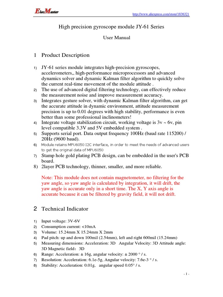 JY-61 is designed by Elecmaster by using mpu6050,it can give pitch roll and yaw angle ,so it is powerful,and it can send Gyro + Accelerometer ,and it can apply to 51 stm avr and arduino micr…