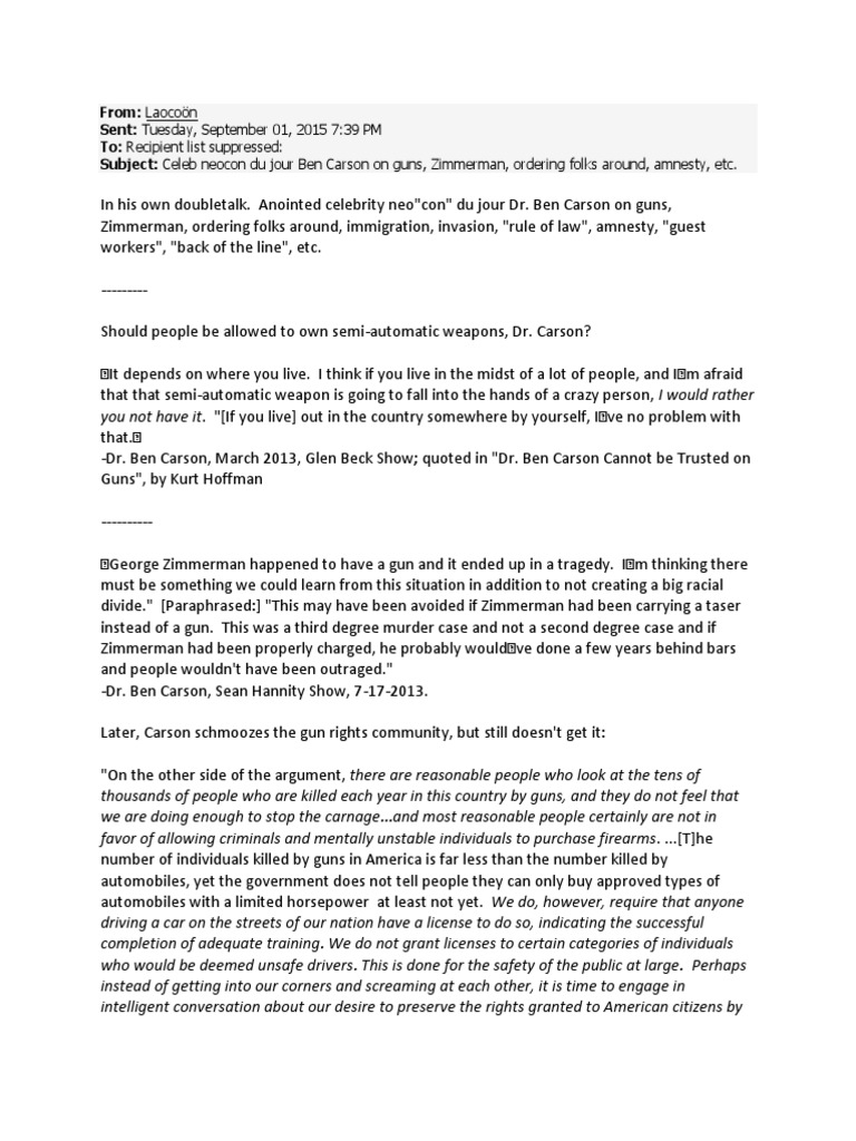 Subject: Celeb neocon du jour Ben Carson on guns, Zimmerman, ordering folks around, amnesty, etc.