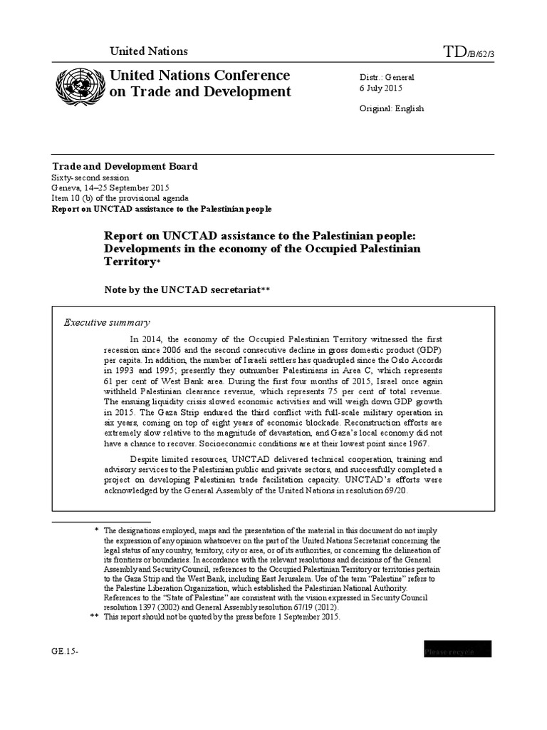 Report on UNCTAD assistance to the Palestinian people: Developments in the economy of the Occupied Palestinian