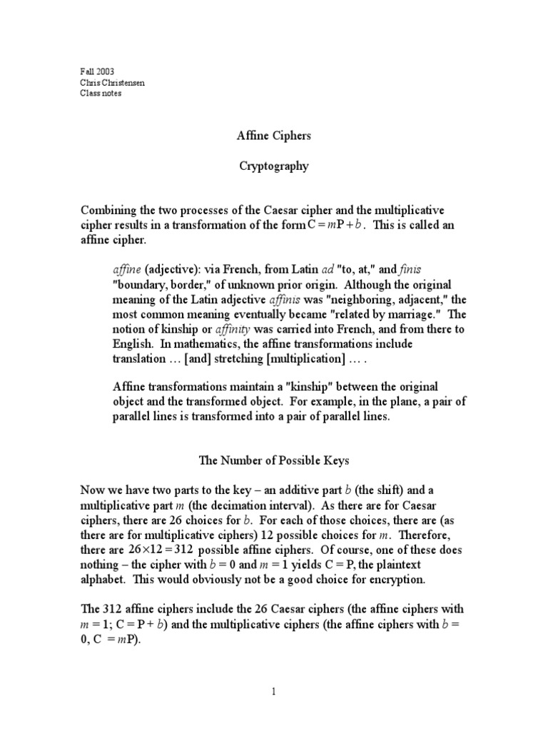 1. Construct a plaintext-ciphertext correspondence for an affine cipher