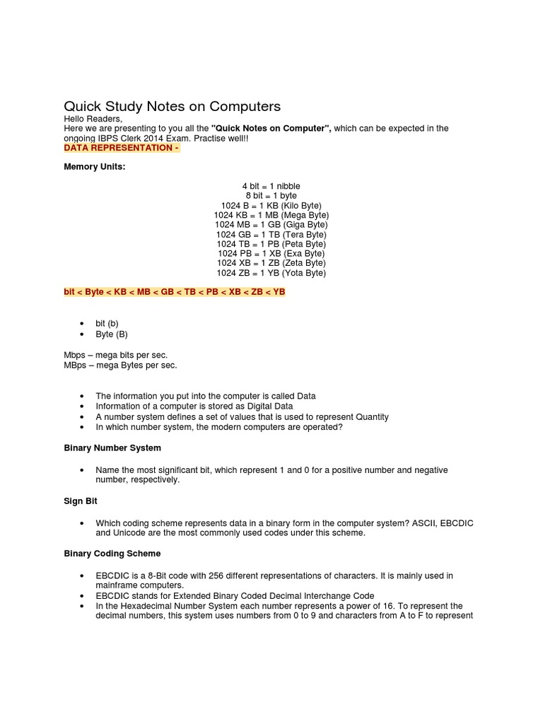 Quick Study Notes on Computers