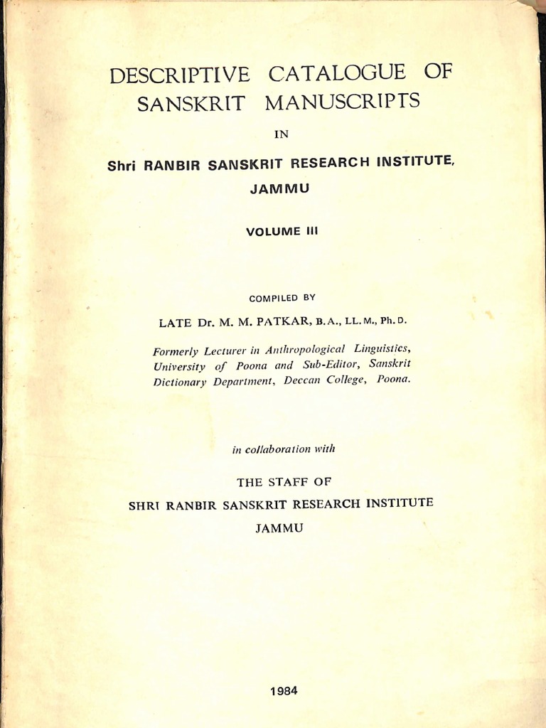 Descriptive Catalog of Sanskrit Manuscripts in Sri Ranbir Sanskrit Research Insitute Jammu Volume III - M.M. Patkar - Part1