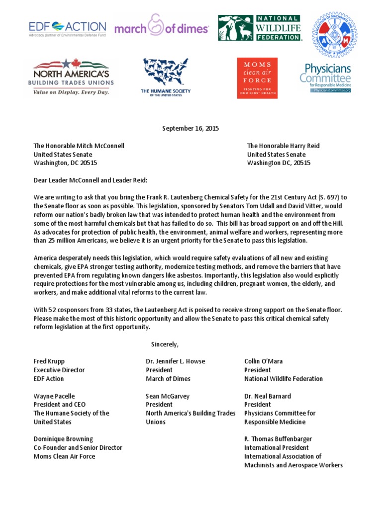 Letter from Groups Representing More than 25 Million Americans Asks for Senate Vote on Lautenberg Chemical Safety Reform