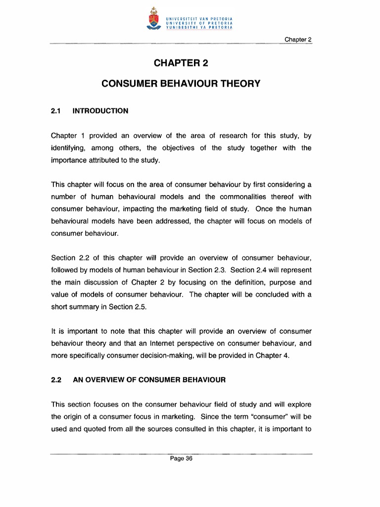 Chapter 2 provided a discussion on consumer behaviour by focusing on the