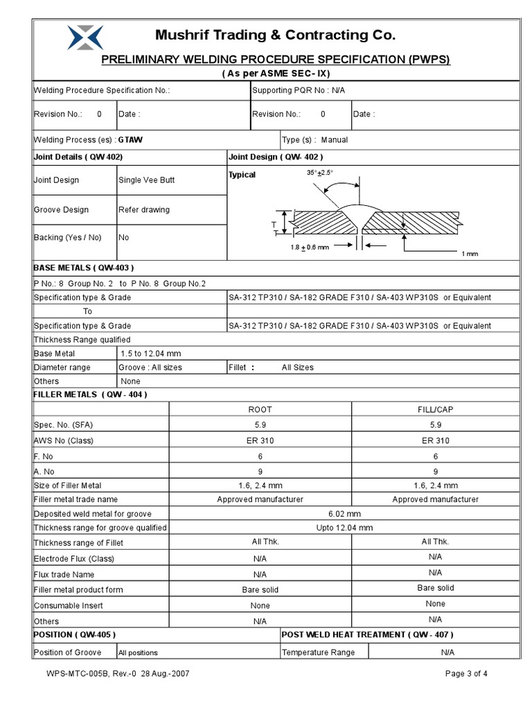PRELIMINARY WELDING PROCEDURE SPECIFICATION (PWPS)