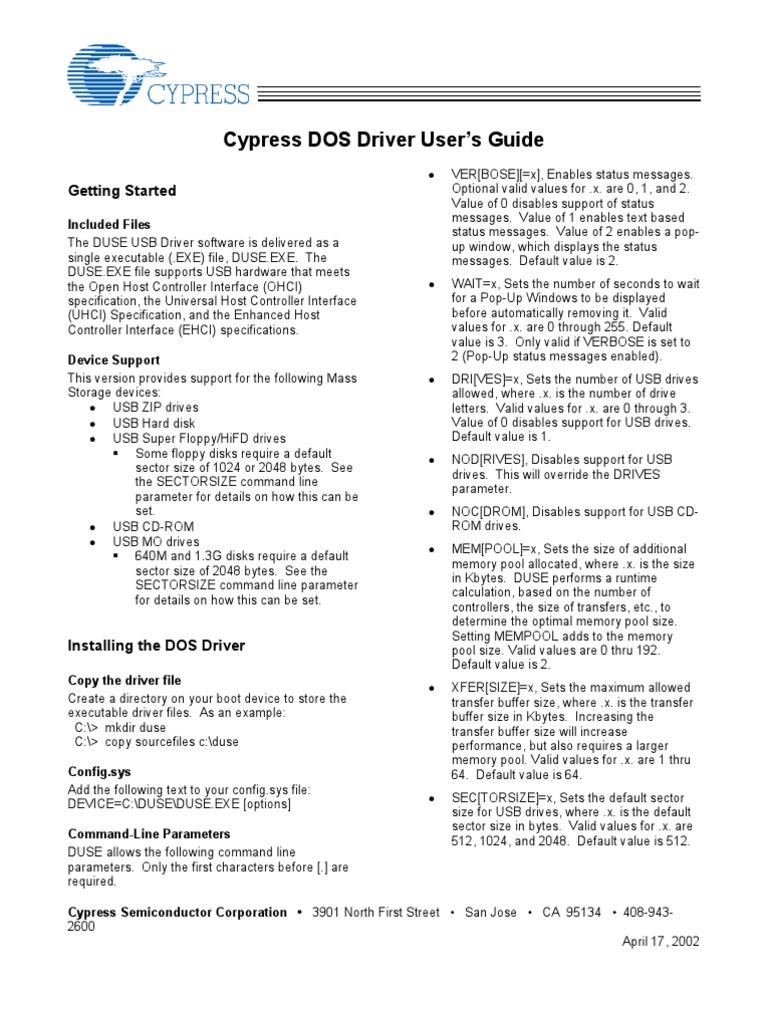 The DUSE USB Driver software is delivered as a single executable (.EXE) file, DUSE.EXE. The DUSE.EXE file supports USB hardware that meets the Open Host Controller Interface (OHCI) specification, the Universal Host Controller Interface (UHCI) Specification, and the Enhanced Host Controller Interface (EHCI) specifications.