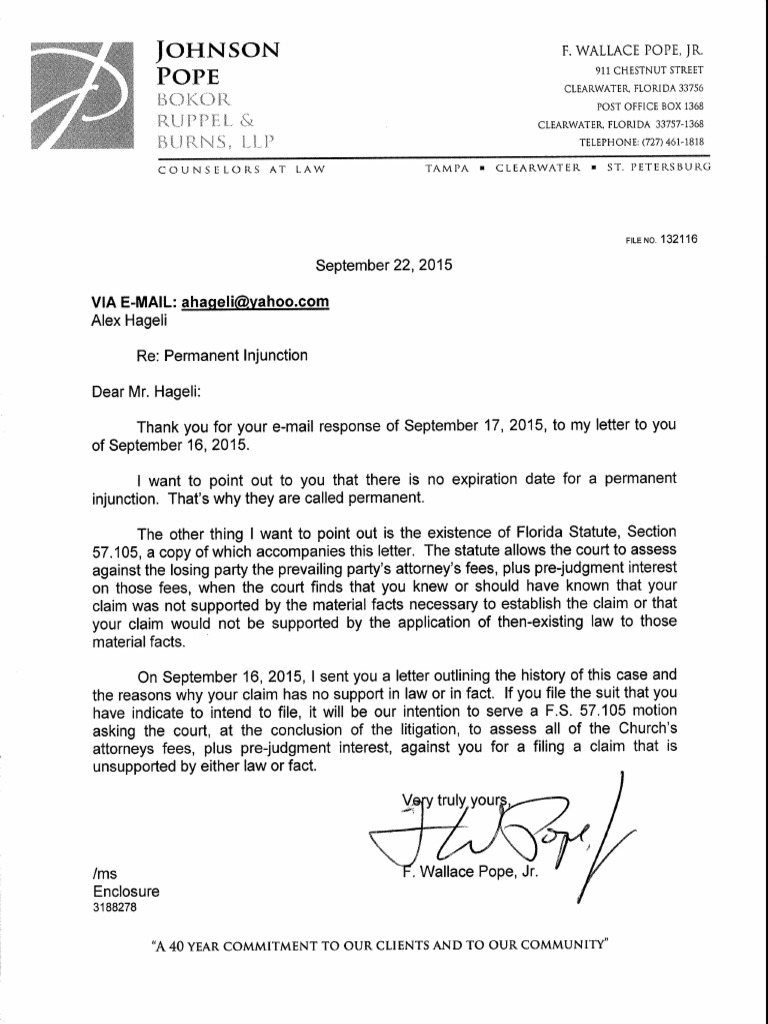 Wally Pope's letter of Sept 22 threatening to hit Hageli with attorney's fees if he challenges the LMT injunction