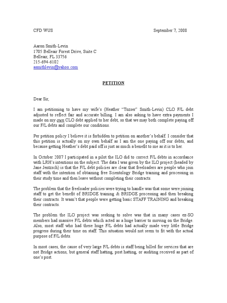 - Aaron Smith-Levin is petitioning to have his wife Heather's CLO F/L debt adjusted and considered paid in full based on overpayments he made to his own CLO debt.