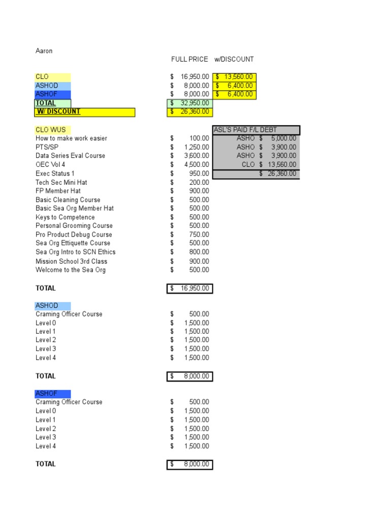 Freeloader Debt Itemized - Church of Scientology. FL Debt is for Aaron Smith-Levin and his wife.