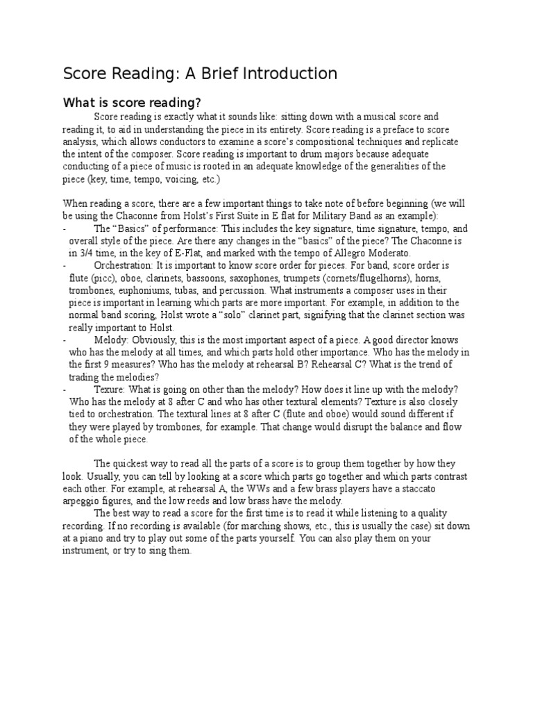 reading it, to aid in understanding the piece in its entirety. Score reading is a preface to score