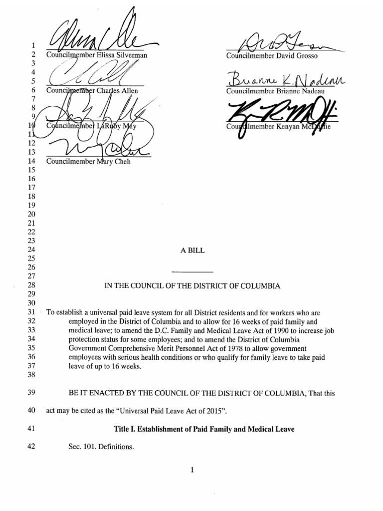 D.C. Councilmembers David Grosso and Elissa Silverman plus six of their colleagues introduced this legislation on October 6, 2015 to provide up to 16 weeks of paid family medical leave to D.C. workers.