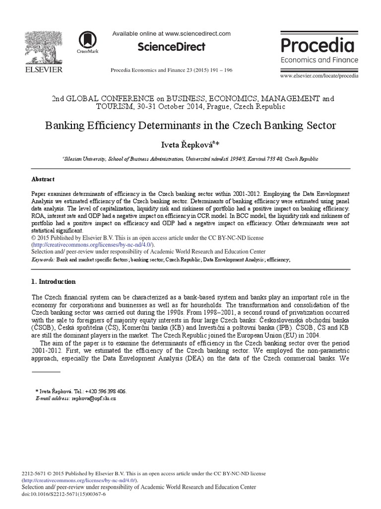 Keywords: Bank and market specific factors; banking sector; Czech Republic; Data Envelopment Analysis; efficiency;