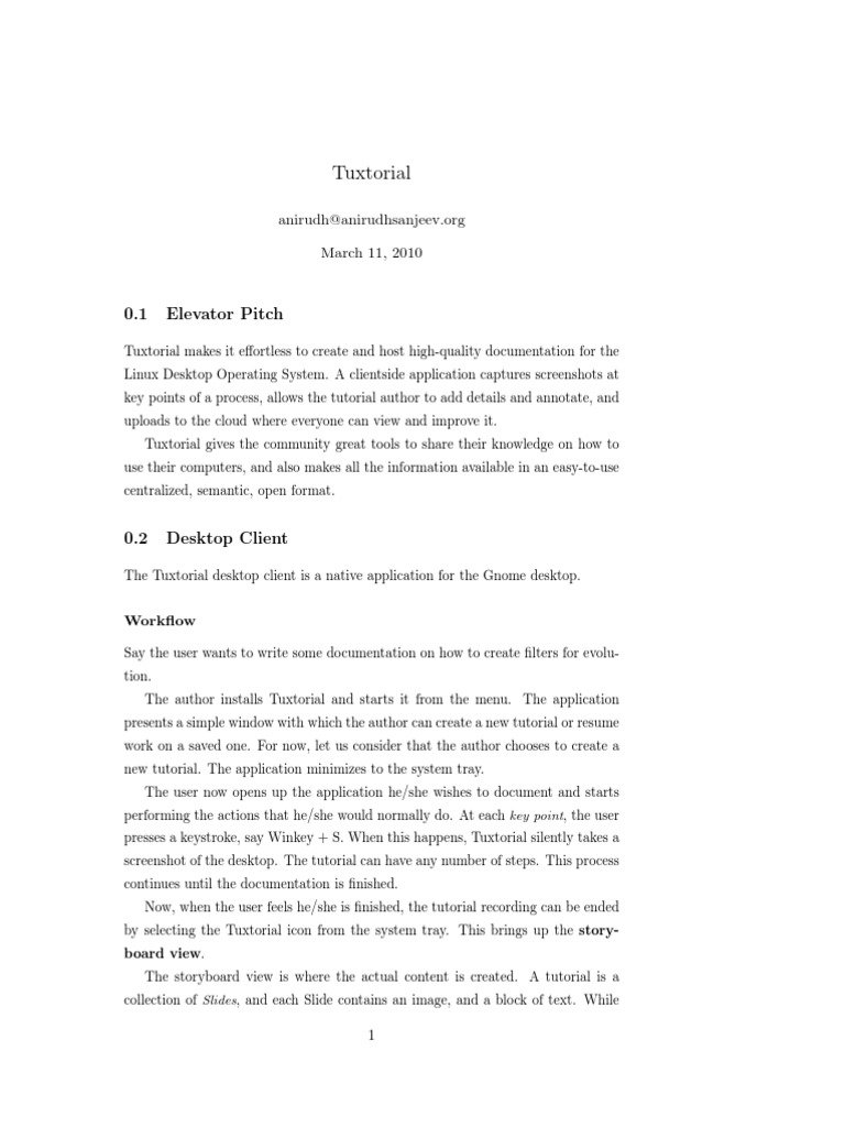 There is a lot of documentation on Linux, but unfortunately all of it is scatteredaround on various forums, blog posts, wikis, etc.A documentation author will be able to upload tutorials directly to tuxto-rial.com from the application. This saves the hassle of finding hosting for images,uploading individually and writing the markup by hand.Each tutorial will get it’s own unique URL, and can be linked to by otherwebsites or found by search engines, where users are provided with a clean, clutterfree interface where they can read the tutorials step by step.In accordance with the spirit of open source, each user will be able to “branch”a tutorial that he/she wasn’t the author of and contribute the changes back. Whilethis functionality is set to be implemented in a later release, the backend is beingplanned with this functionality in mind.Users will also be able to comment on individual tutorials and slides, and alsoconfirm that the instructions worked as planned, to increase the overall trust afuture user will place in said documentation.