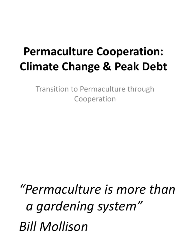 Permaculture Cooperation: Climate Change & Peak Debt Transition to Permaculture through Cooperation “Permaculture is more than a gardening system” Bill Mollison What is Peak Debt? Hubbert Peak in debt Economies from individuals, households, national economies Point where the ability to repay to interest/fees etc beyond the income of the debtor Plutonomy Ajay Kapur, 2006, global strategist Citigroup, defined six factors create and maintain plutonomy: business-friendly government and tax policies increasingly complex financial systems control of the rule of law globalization technology changes patent protection