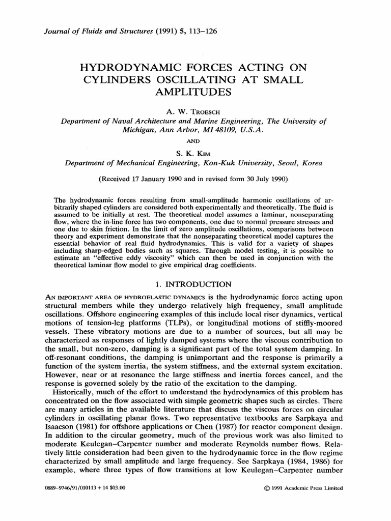 SARPKAYA, T. 1986 Force on circular cylinder in viscous oscillatory flow at low KeuleganCarpenter numbers. Journal of Fluid Mechanics 65, 61-71.