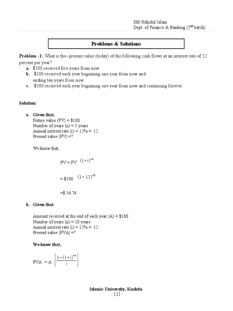 Problem -1: What is the- present value (today) of the following cash flows at an interest rate of 12