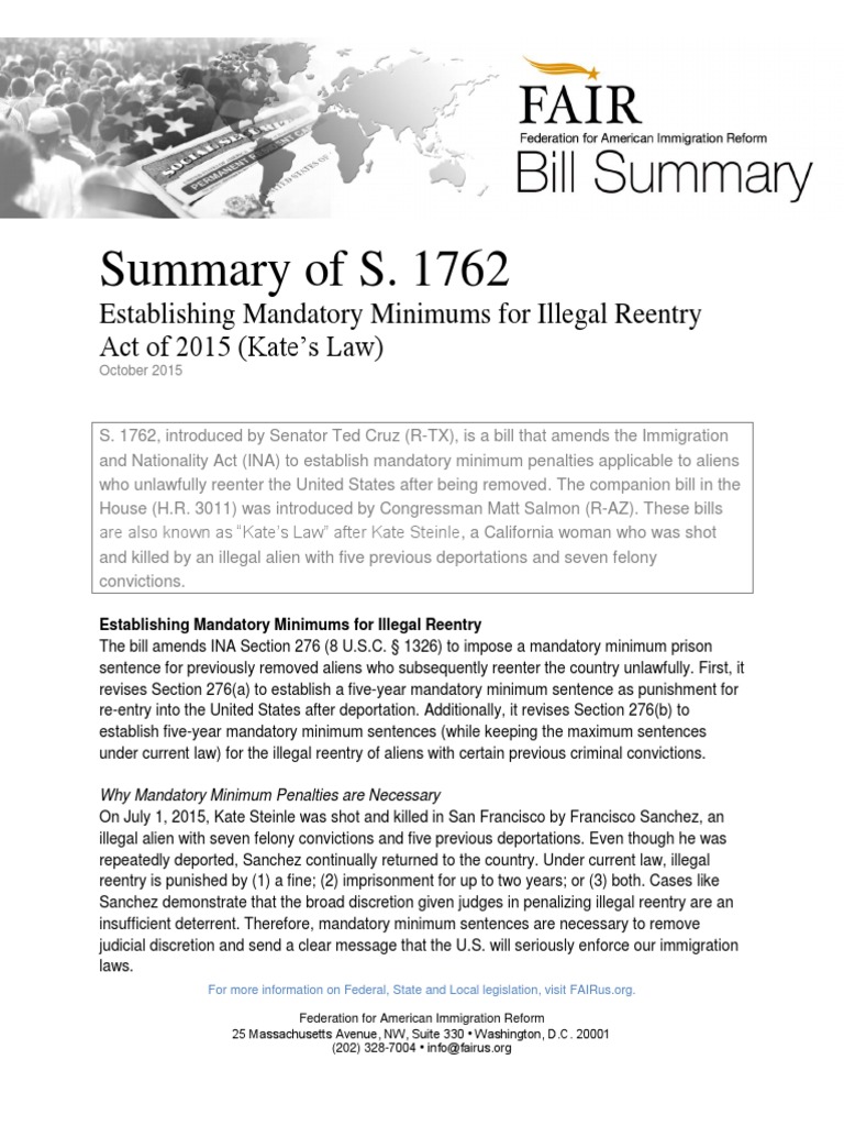 S. 1762, introduced by Senator Ted Cruz (R-TX), is a bill that amends the Immigration and Nationality Act (INA) to establish mandatory minimum penalties applicable to aliens who unlawfully reenter the United States after being removed. The companion bill in the House (H.R. 3011) was introduced by Congressman Matt Salmon (R-AZ). These bills are also known as “Kate’s Law” after Kate Steinle, a California woman who was shot and killed by an illegal alien with five previous deportations and seven felony convictions.