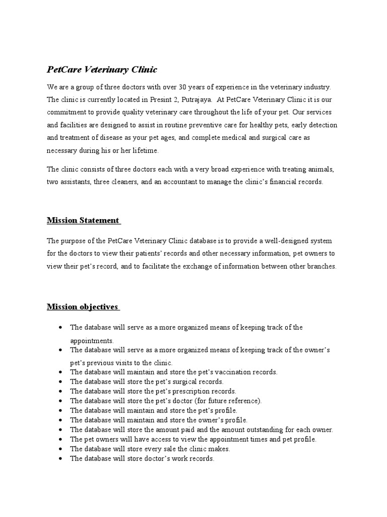 The purpose of the PetCare Veterinary Clinic database is to provide a well-designed system