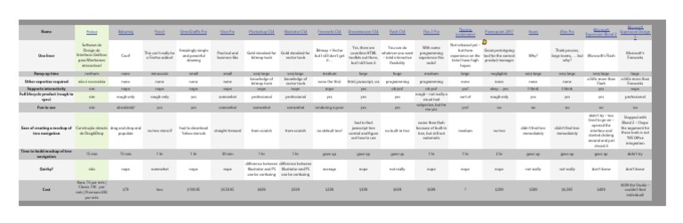 Name Pidoco Balsamiq Pencil OmniGraffle Pro Visio Pro Photoshop CS4 Illustrator CS4 Fireworks CS4 Dreamweaver CS4 Flash CS4 Flex 3 Pro Powerpoint 2007 Axure iRise Pro Expression Design