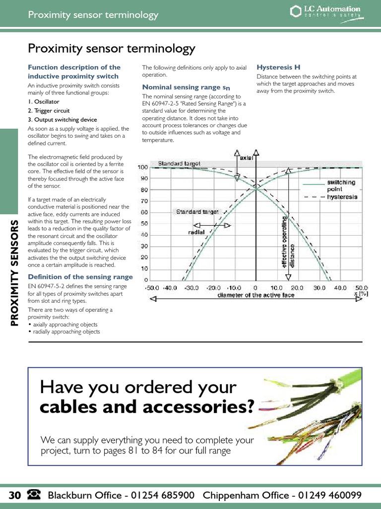 This document provides definitions and information related to proximity sensor terminology and operation. It discusses the key components and functioning of inductive proximity switches, including the oscillator, trigger circuit, and output switching device. It defines important proximity switch specifications like nominal sensing range, hysteresis, and sensing range. It also covers topics like target materials, reduction factors, cylindrical proximity switch sizes, embeddable vs non-embeddable sensors, and factors that can influence sensing range.