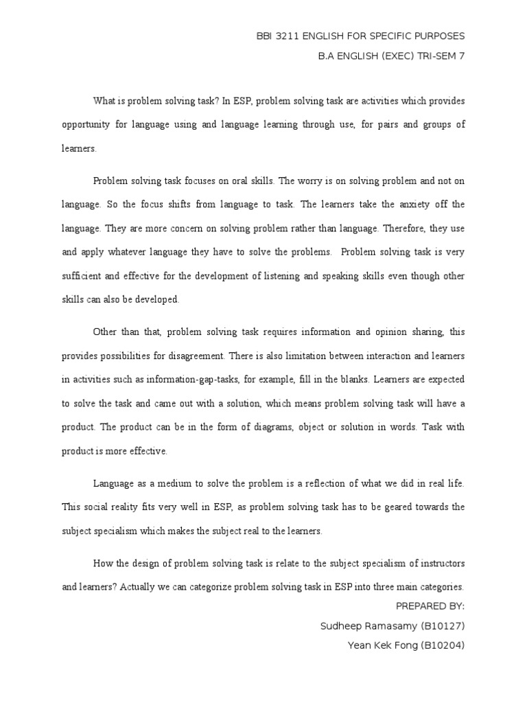 What is problem solving task? In ESP, problem solving task are activities which provides