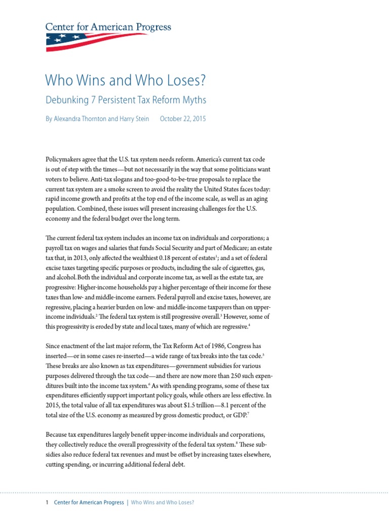 Tus, when considering proposals o reorm personal income axes, business axes, or any oher par o he ax sysem, he mos imporan quesion o ask is: Who wins and who loses? I he winners are hose who have he abiliy o pay more, or i he losers are hose who have less abiliy o pay, policy-makers and ciizens should be skepical. Wih ha quesion in mind, his repor examines seven claims commonly employed in he ax reorm debae and separaes myh rom realiy. Poliicians requenly use hese claims o dodge he undamenal quesion o who wins and who loseswho would pay more, and who would pay lessunder heir respecive ax agendas.