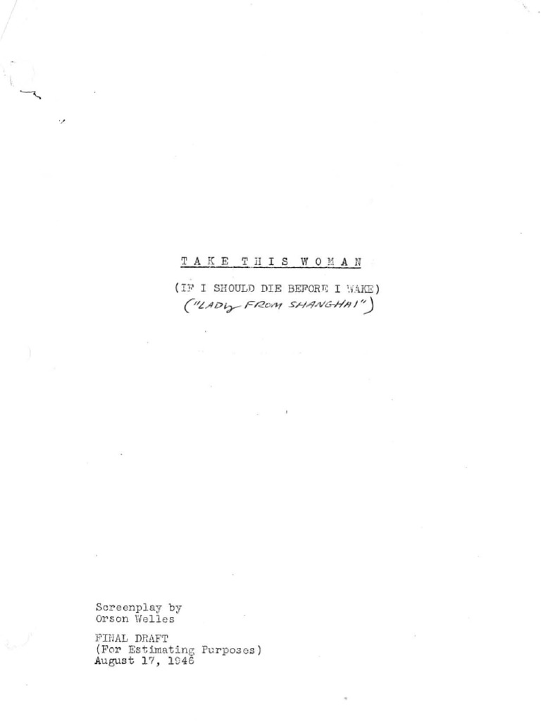 Script for Orson Welles Columbia Pictures thriller starring Rita Hayworth.