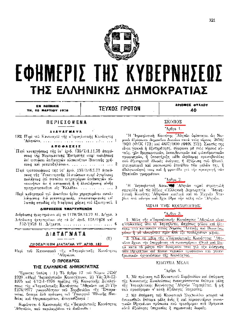 ΠΔ 182/78 ΙΣΡΑΗΛΙΤΙΚΗ ΚΟΙΝΟΤΗΤΑ ΑΘΗΝΩΝ