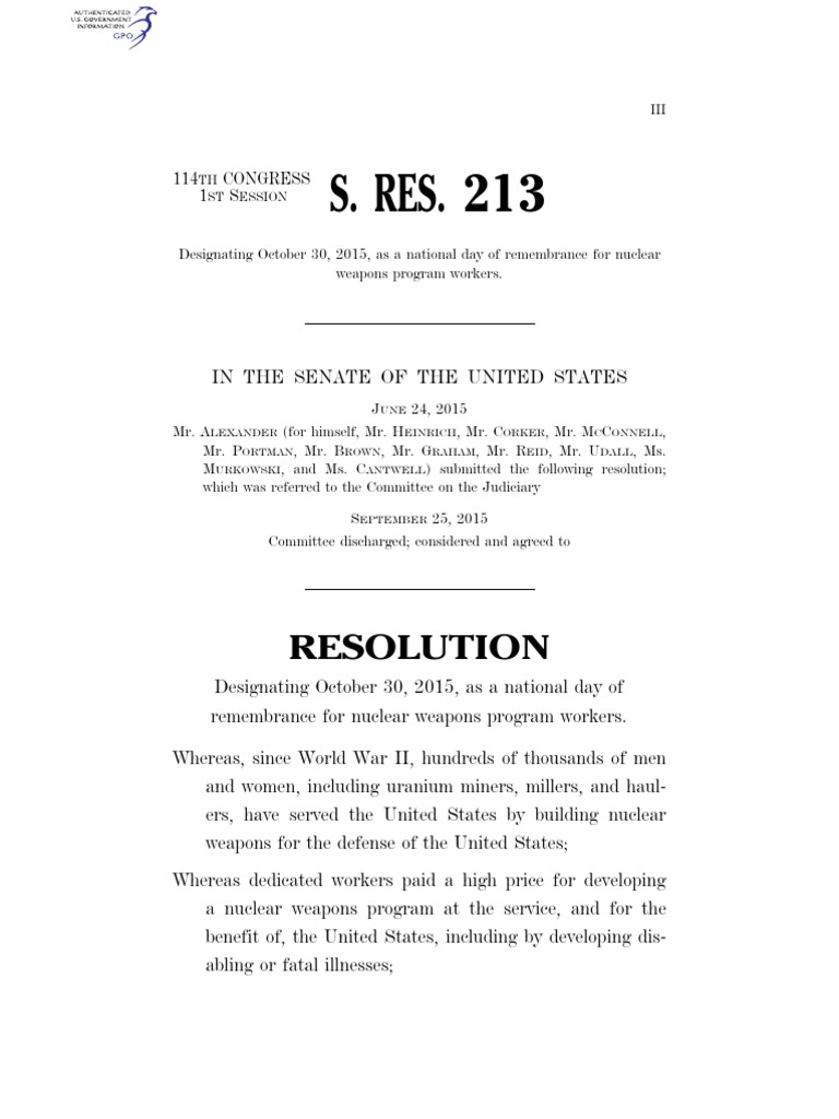 Designating October 30, 2015, as a national day of remembrance for nuclear weapons program workers.