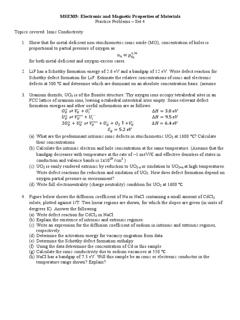 1. Show that for metal-deficient non-stoichiometric ionic oxide (MO), concentration of holes is
