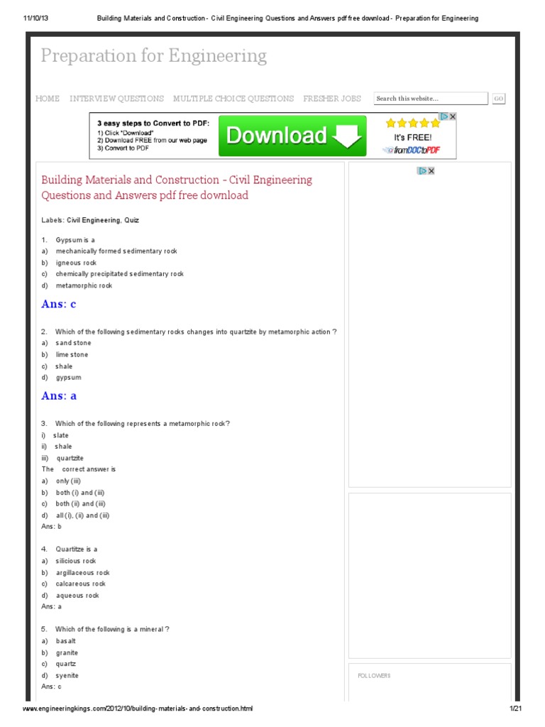Building Materials and Construction - Civil Engineering Questions and Answers pdf free download - Preparation for Engineering