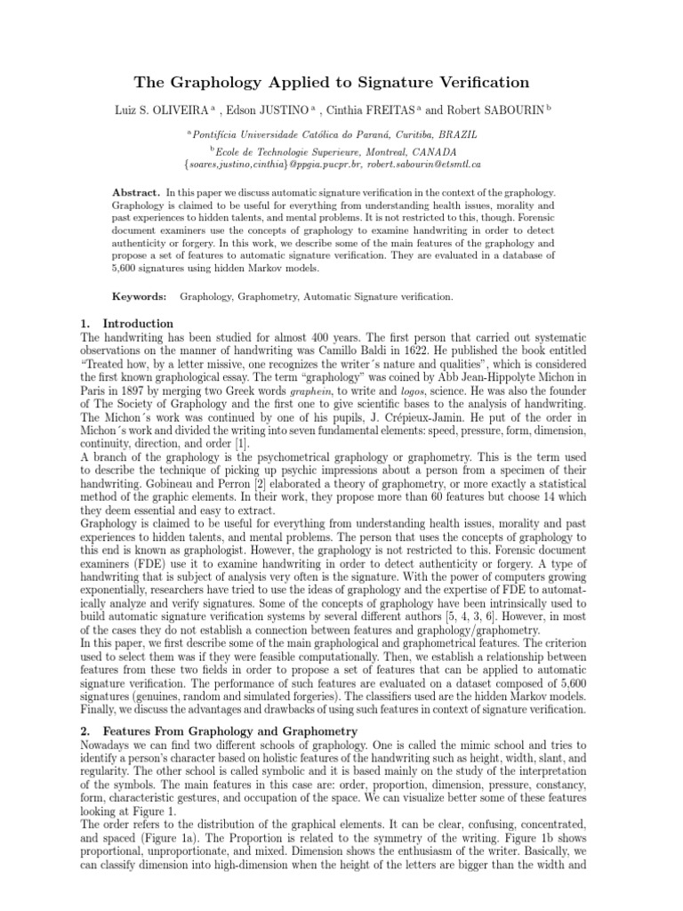 authenticity or forgery. In this work, we describe some of the main features of the graphology and
