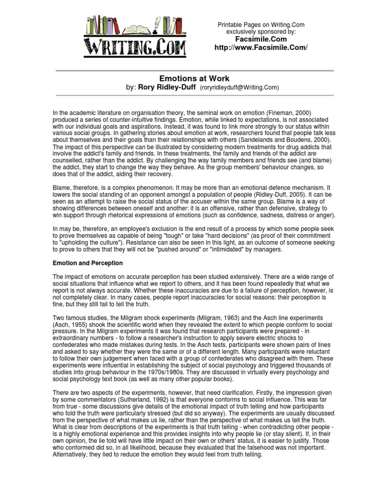 In the academic literature on organisation theory, the seminal work on emotion (Fineman, 2000)