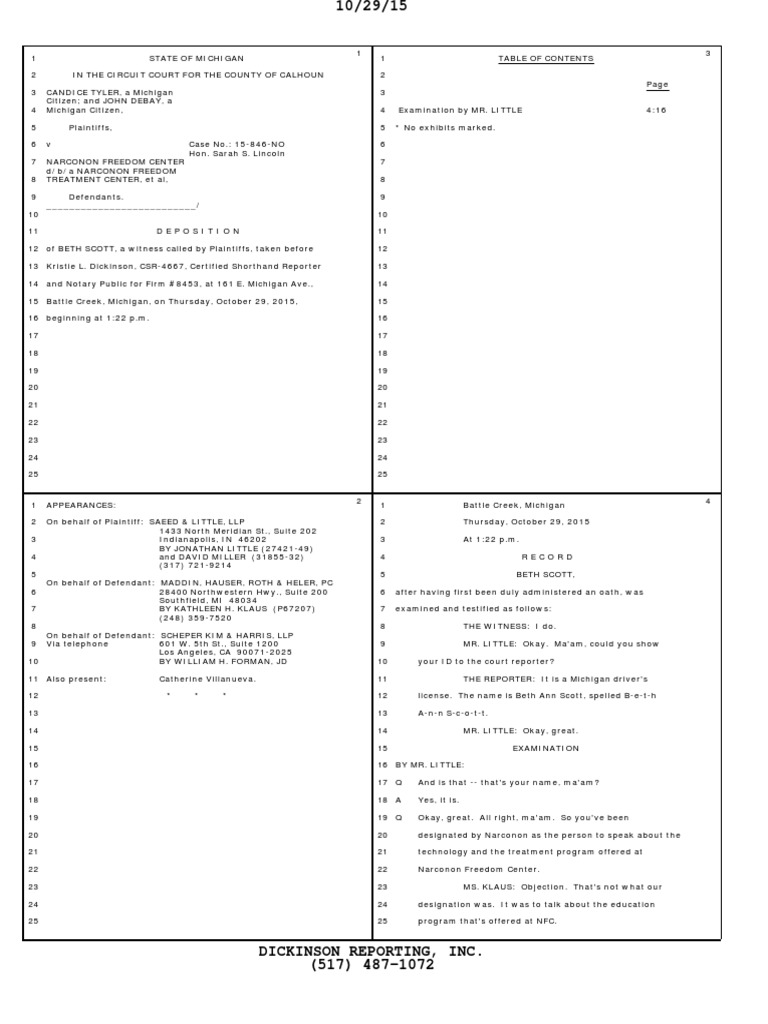 of BETH SCOTT, a witness called by Plaintiffs, taken before