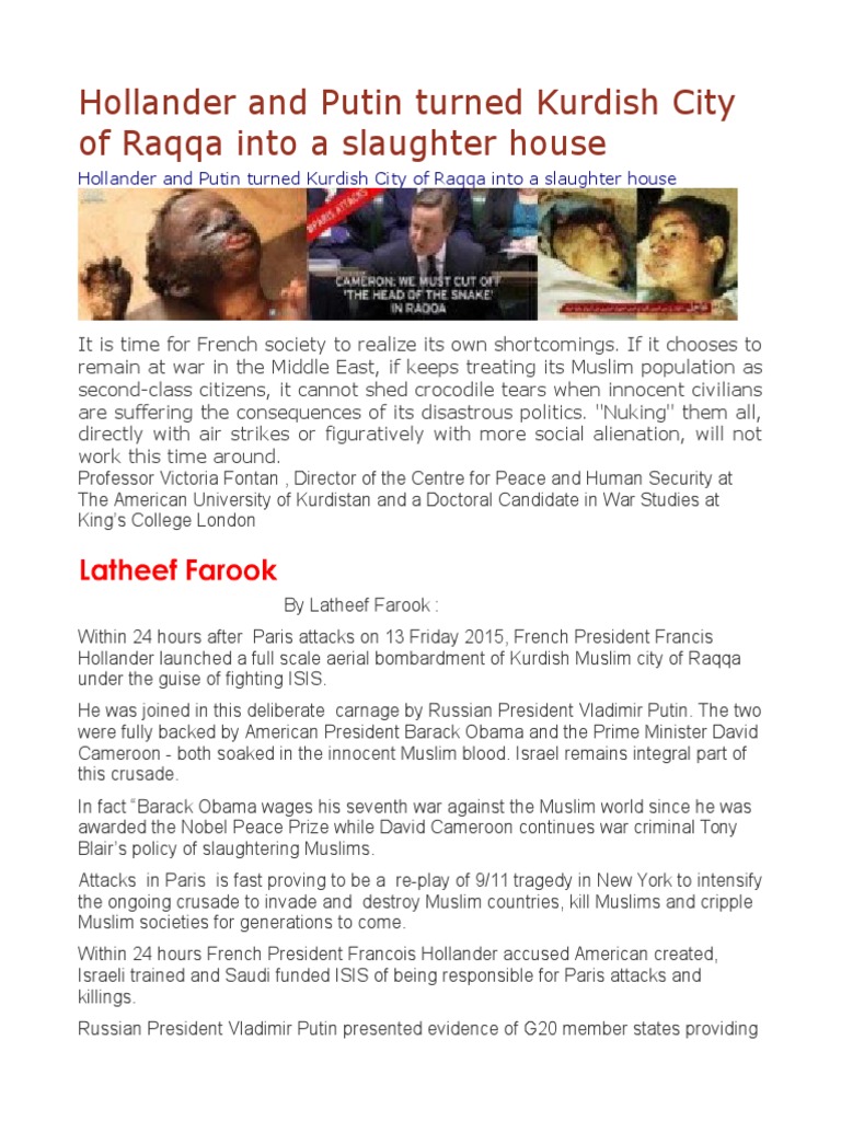 Hollander launched a full scale aerial bombardment of Kurdish Muslim city of Raqqa