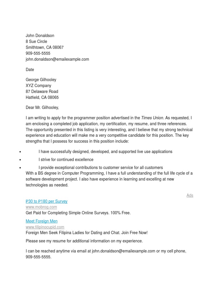 I can be reached anytime via email at john.donaldson@emailexample.com or my cell phone,
