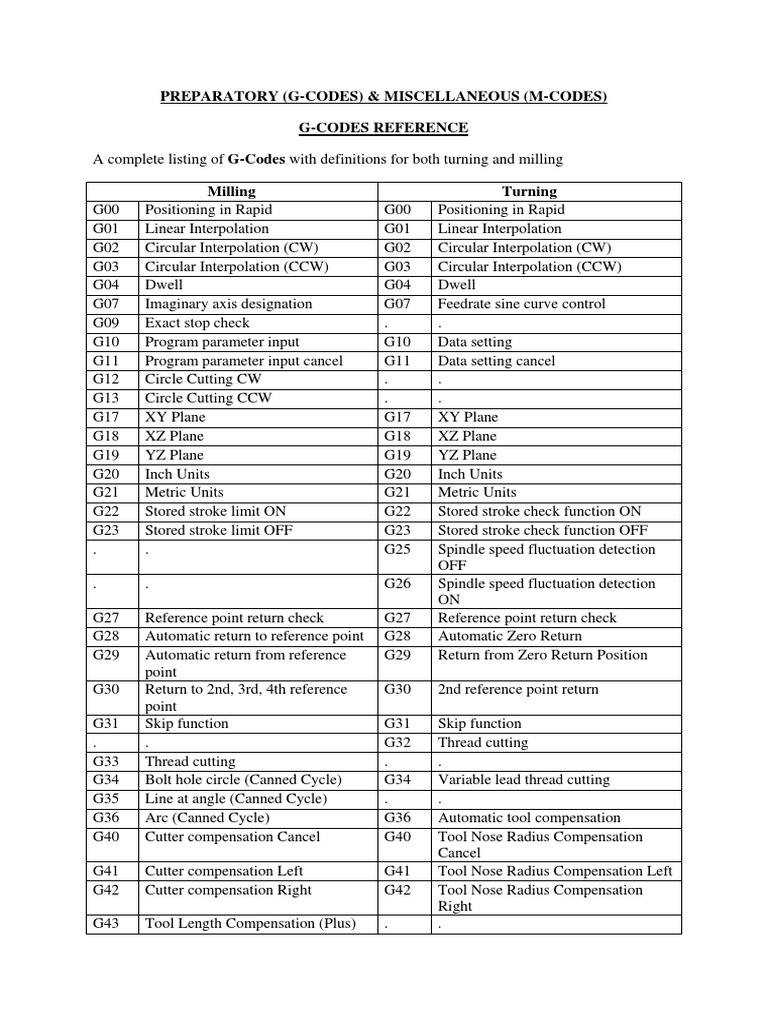 A complete listing of G-Codes with definitions for both turning and milling