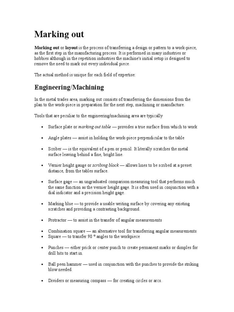 Marking out or layout is the process of transferring a design or pattern to a work-piece,