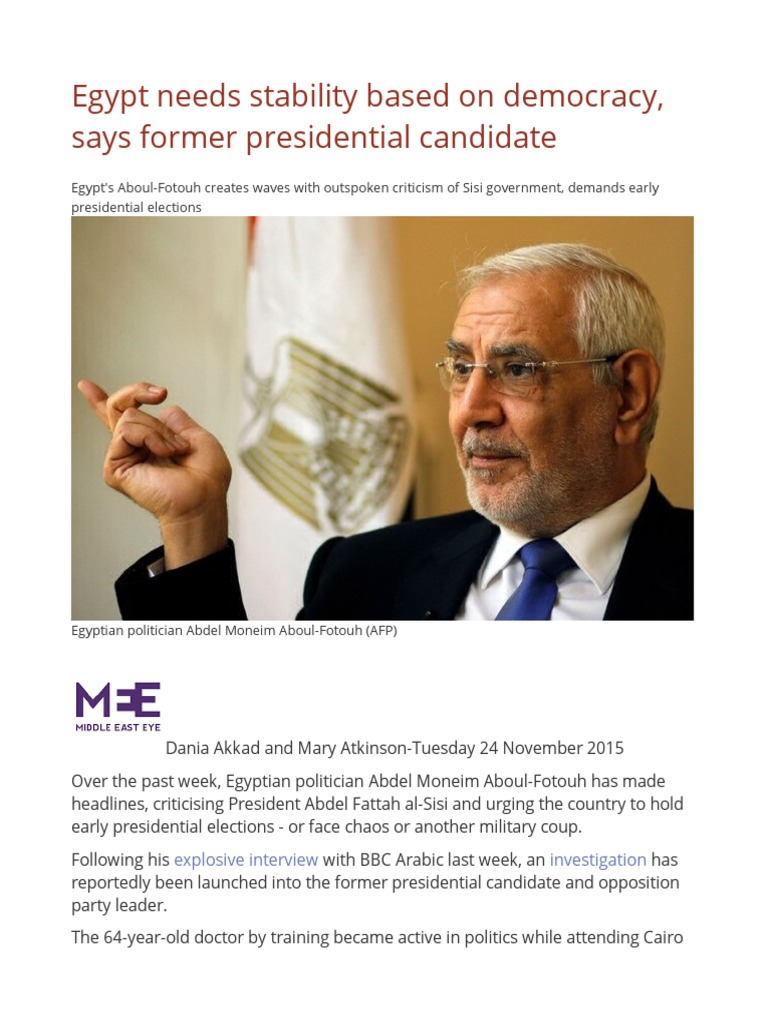 Here, the veteran politician talks to Middle East Eye about Egypt's struggling