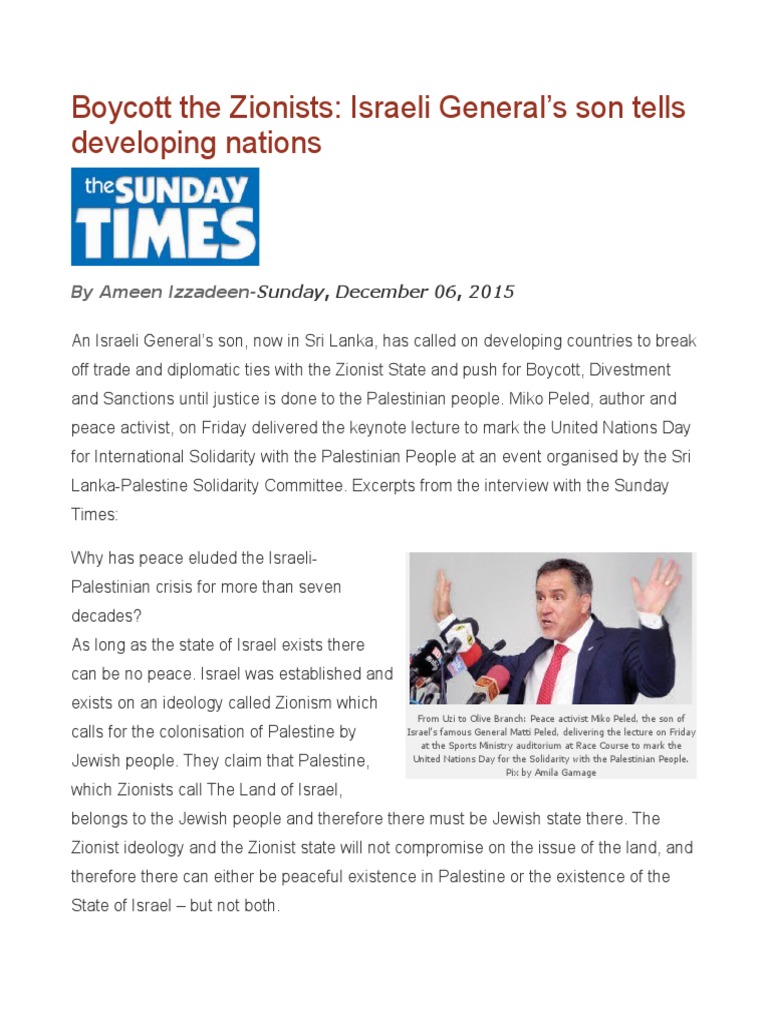 peace with the Palestinians. Israelis and Palestinians can only live in peace in a postZionist democratic Palestine. The settlements in the West Bank are not unique; they