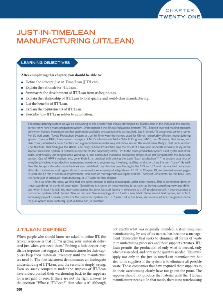 Chapter Twenty One Just-in-Time/Lean Manufacturing (JIT/Lean)