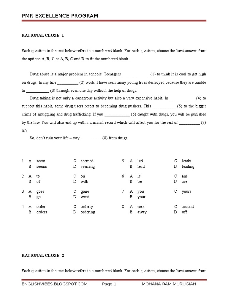 the options A, B, C or A, B, C and D to fit the numbered blank.
