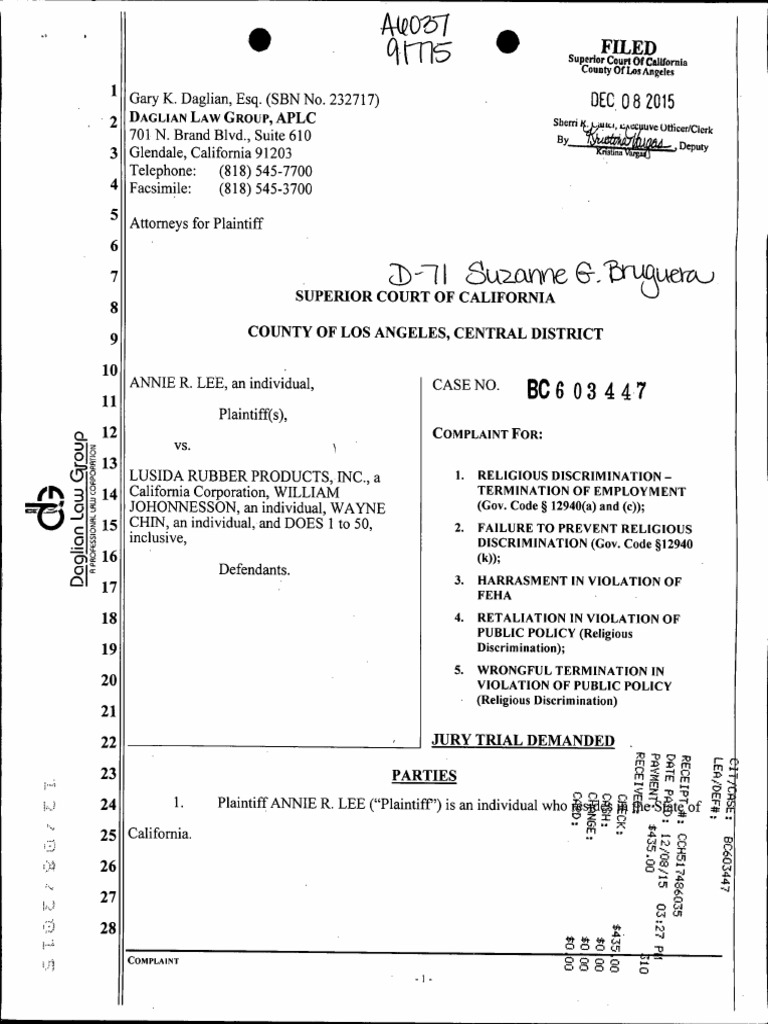 Annie Lee sues Lusida Rubber, Wayne Chin, and Bill Johonnesson for forcing Scientology on her and firing her when she refused