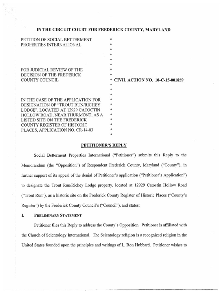 Scientology's reply after the county opposed its petition for judicial review regarding the Trout Run zoning vote