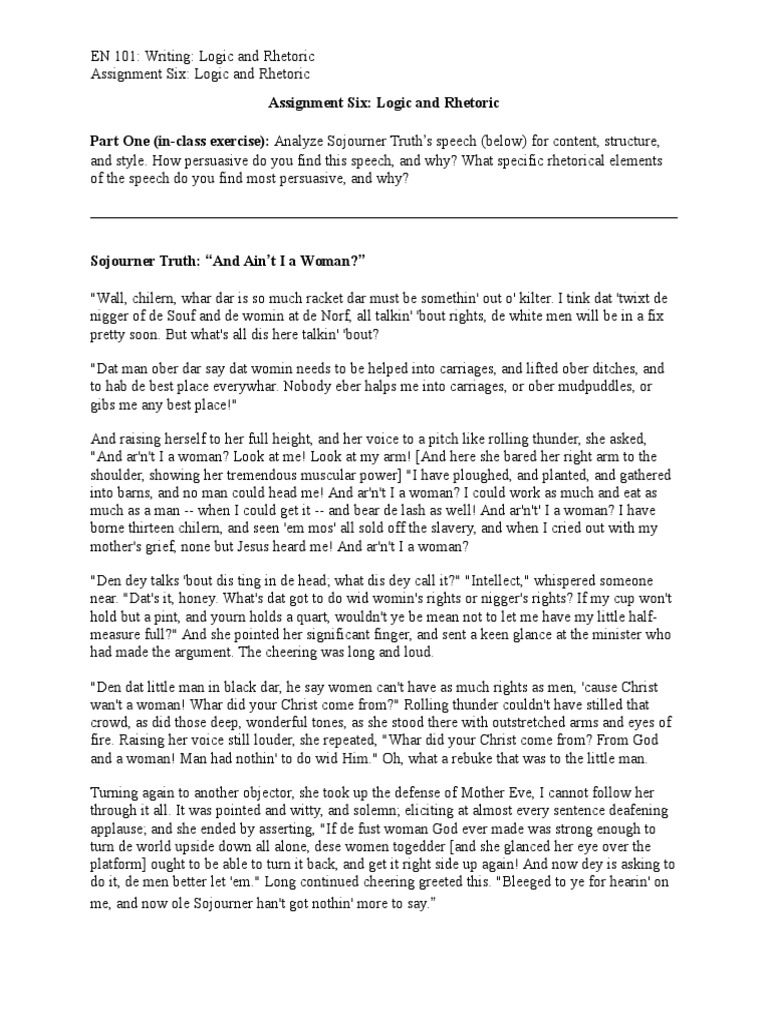 Part One (in-class exercise): Analyze Sojourner Truths speech (below) for content, structure,