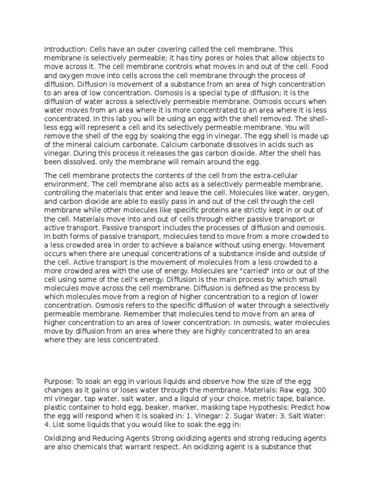concentrated. In this lab you will be using an egg with the shell removed. The shellless egg will represent a cell and its selectively permeable membrane. You will
