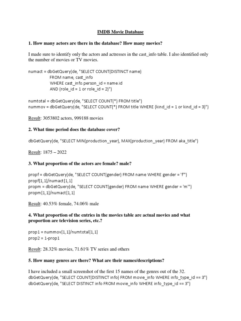 q10 = dbGetQuery(de, "SELECT name, COUNT(name) AS NumMovies, MIN(production_year),