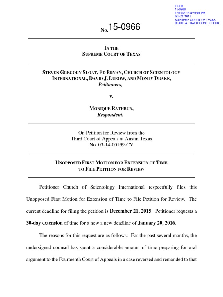 , which is due to be filed on Wednesday, December 23, 2015, just two days after the deadline for the petition in this case. This extension is not sought for the purposes of delay. No prior extension has been granted for this deadline. As set forth in the Certificate of Conference below, this motion for extension of time is unopposed. For these reasons, petitioner Church of Scientology International requests that its Unopposed First Motion for Extension of Time be granted, and that the deadline for filing its petition for review be extended 30 days to January 20, 2016.